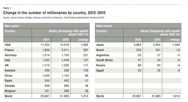 Bene, in questo rapporto si dice, con assoluta serenità, che nel 2012 in Italia i milionari (cioè quelli che nel 2012 hanno guadagnato più di un milione di euro) sono aumentati del 9,5 percento. Erano 1.412 mila alla fine del 2011 e sono diventati 1.529 mila a fine 2012. Ah, non si troverà traccia di tutto questo, nelle dichiarazioni dei redditi, perché quelli da capitale sono redditi tassati alla fonte, direttamente in banca, e quindi non rientranti nelle dichiarazioni Irpef.