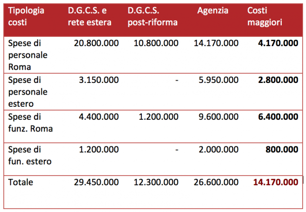 Le unità tecniche locali destinate alle sedi distaccate sono ridotte da 27 a 24 mentre il personale a contratto locale conterà su 168 unità. Ovvero 192 persone all’estero contro 257 dislocate a Roma. Nella nuova agenzia che si occuperà di sviluppo si conteranno, alla fine, solo 56 tecnici e ben 201 figure giuridico amministrative. Che vanno ad aggiungersi al personale della Direzione Generale per la cooperazione del Ministero che continua a esistere con 118 dipendenti che costano 10,8 milioni l’anno, portando così il conto finale della “macchina della cooperazione” alla cifra record 38,9 milioni di euro. Più soldi, quindi, per quelli che stanno bene, a Roma, meno per i progetti di aiuto ai paesi poveri. Se si voleva “proiettare” la cooperazione nel mondo rendendola più snella ed efficiente, anche solo per teste e stipendi, l’esito della riforma pare una controriforma.