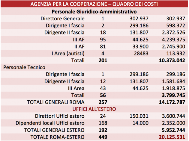 Tornando alla nascente Agenzia, la vera innovazione della riforma, sarà vigilata dal ministero e trova la sua ratio originaria nella “possibilità di utilizzare strumenti finanziari innovativi senza sottostare ai vincoli delle norme pubblicistiche sui contratti, come recita la relazione che illustra la riforma. Tra le altre, potrà “assumere personale competente secondo schemi privatistici e maggiore flessibilità di azione”. E qui il rischio-carrozzone si fa pesante, come rivelano le cifre della relazione tecnica allegata alla legge. Il personale (257 dipendenti a Roma e 192 dislocati all’estero) impegnerà ogni anno 7 milioni di euro in più rispetto all’attuale assetto, portando a quota 30 milioni il peso della voce “personale” sul totale del bilancio della cooperazione. E si capisce perché. L’agenzia avrà un direttore generale con stipendio parametrato a quello del Primo presidente della Corte di Cassazione e questo significa che l’uomo a capo della “macchina” che porta aiuti ai paesi poveri, metterà in tasca ogni anno 302mila euro. Di poco sotto, nell’organigramma dell’AICS, due dirigenti di prima fascia da 299mila euro e 18 da 131mila euro. Seguono 81 dipendenti delle aree funzionali e 56 profili di personale tecnico variamente inquadrato, dal dirigente di prima fascia a 299mila a 12 di seconda a 131mila, infine 43 da 44mila euro l’anno. Sommando i maggiori oneri in spese per il personale a quelli per il funzionamento (7,1 milioni l’anno), l’agenzia finisce per produrre un costo aggiuntivo di 14,2 milioni di euro l’anno rispetto a quelli pre-riforma. E alla fine, quanti andranno all’estero a seguire i progetti e quanti resteranno a Roma a frollare burocrazia?