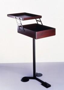 Il tavolino Comodo è quello che quel giorno mi ha colpito di più, non solo per il prodotto in sé, ma per come ci è stato descritto il momento in cui l’architetto ha cominciato a pensarlo. Potremmo definire Comodo un antenato di ciò che oggi chiamiamo ‘autoproduzione’, più che altro perché Castiglioni l’ha disegnato per sé: in quel momento aveva bisogno di un tavolino da lavoro da tenere accanto al letto, quindi con un sostegno che lo rendesse facile da avvicinare e allontanare, con un piano d’appoggio non troppo ingombrante e, nello stesso tempo, con uno scomparto facile da aprire dove tenere gli strumenti da lavoro. Giovanna, in verità, ci ha confessato che suo padre nascondeva in quello scomparto caramelle e cioccolatini di cui andava ghiotto! Ma non è tutto, anzi: la parte più affascinante del racconto è la spiegazione del sistema usato per l’apertura del contenitore inferiore: osservandola bene, infatti, non può non far venire in mente le vecchie scatole da cucito o le cassette degli attrezzi.