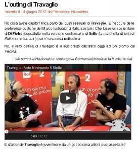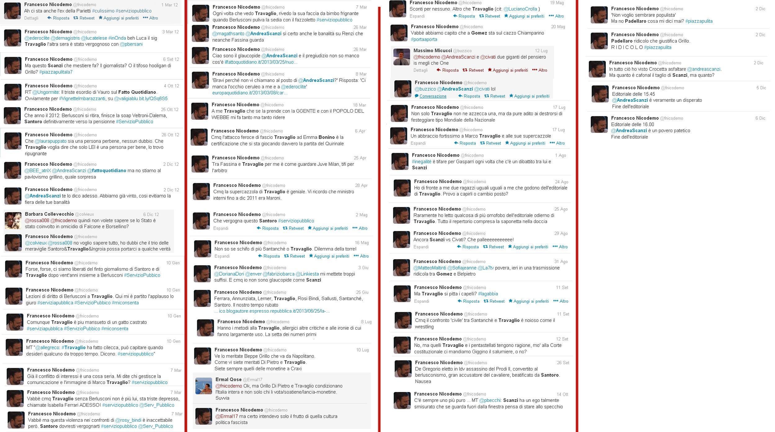 “Ah ci sta anche l’ex della Parietti #culissimo” (1 marzo 2012). “Travaglio l’altra sera è stato vergognoso” (3 marzo 2012). “Ma questo Scanzi che mestiere fa? Il giornalista? O il tifoso hooligan di Grillo?” (6 settembre 2012). “Santoro definitivamente verso la pensione” (25 ottobre 2012). “Fatto Quotidiano. Stiamo al pavlovismo grillino” (2 dicembre 2012). “Scanzi te lo dico adesso. Abbiamo già vinto, così evitiamo la fiera delle tue banalità” (2 dicembre 2012. Di lì a poco, lui – ma più che altro Renzi, perché Nicodemo non lo voterebbe neanche Nicodemo – avrebbe non-vinto le Primarie). “Forse ci siamo liberati del finto giornalismo di Santoro e di Travaglio” (10 gennaio 2013). “Travaglio è più mansueto di un gatto castrato” (10 gennaio 2013). “Travaglio ha fatto cilecca, può capitare quando desideri qualcuno da troppo tempo” (10 gennaio 2013: qui, gliene va dato atto, parlava probabilmente con cognizione di causa). “Travaglio senza Berlusconi non è più lui, sta triste depresso, chiamate Isabella Ferrari” (7 marzo 2013). “Ogni volta che vedo Travaglio, rivedo la sua faccia da bimbo frignante quando Berlusconi puliva la sedia con il fazzoletto” (7 marzo 2013). “Ciao sono il glaucopide Andrea Scanzi e il pregiudizio non so manco cos’è” (26 marzo 2013). “L’attacco feroce di fascio Travaglio” (6 aprile 2013). “Tra Fassina e Travaglio per me è come guardare Juve-Milan, tifi per l’arbitro” (6 aprile 2013). “Che vergogna questo Santoro” (2 maggio 2013). “Non so se schifo di più Santanché o Travaglio” (16 maggio 2013). “Hanno i metodi alla Travaglio, allergici alle critiche e alle ironie di cui fanno largamente uso. La setta dei numeri primi” (8 luglio 2013. Qui faceva autocritica, ma non lo sapeva: la setta dei numeri terzi, e neanche secondi). “Ve lo meritate Beppe Grillo che va da Napolitano. Come vi siete meritati Di Pietro e Travaglio. Siete sempre quelli delle monetine a Craxi” (10 luglio 2013). “Travaglio non ne azzecca una” (17 luglio 2013). “Tifare per Gasparri ogni volta che c’è un dibattito tra lui e Scanzi” (1 agosto 2013). “Raramente ho letto qualcosa di più omofobo dell’editoriale odierno di Travaglio” (25 agosto 2013).