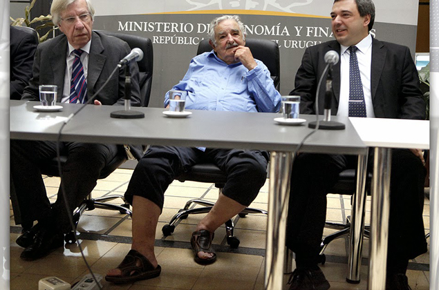 Per la gioia di cameramen e fotografi, “Pepe” s’è presentato alla cerimonia, non solo – come d’abitudine ed in abituale contrasto con l’agghindata presenza del vicepresidente Danilo Astori (a sinistra nella foto) e dello stesso Bergara – senza giacca e cravatta, ma anche senza scarpe. O meglio: con ai piedi calzature aperte che qualcuno ha definito “sandali” ed altri, più brutalmente, “ciabatte” (“chancletas”). Gli uni e le altre, in ogni caso, messi in molto ostentata evidenza, sotto il tavolone della conferenza, da pantaloni risvoltati ben oltre le caviglie, fin quasi e scoprire per intero i floridi polpacci presidenziali.