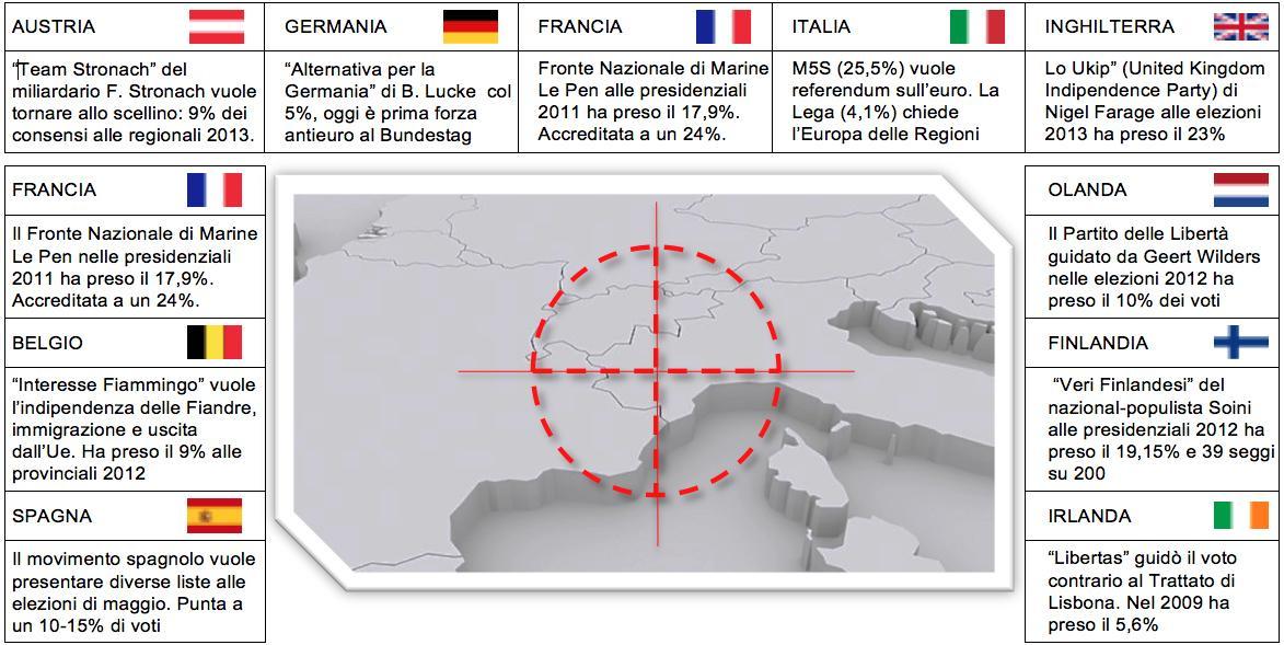 In Spagna il movimento degli Indignados vuole presentare diverse liste alle elezioni di maggio. Anche nell’Europa continentale l’avanzata degli euroscettici è rapidissima. La Francia sta diventando un caso e motivo di forti preoccupazioni per l’avanzata del Fronte Nazionale di Marine Le Pen, estrema destra sociale, che nelle presidenziali del 2011 al primo turno prese il 17,9% e ora è accreditata a un 24%. Il suo menù euroscettico prevede politiche contro l’immigrazione e la moneta unica. In Olanda c’è il Partito delle Libertà guidato da Geert Wilders che nelle elezioni 2012 ha preso il 10% dei voti. In Belgio la grancassa antieuro è affidata a Vlaams Belang (Interesse Fiammingo), estrema destra. Rivendica l’indipendenza delle Fiandre, mano ferma sull’immigrazione e l’uscita dall’orbita della Comunità europea. In Austria fa proseliti il partito Team Stronach fondato dal miliardario austro-canadese Frank Stronach che vorrebbe tornare allo scellino e in cambio di questa promessa ha incassato nelle regionali 2013 il 9% dei consensi. In Germania, paese sul banco degli imputati per l’eurosconquasso, l’ultimo arrivato è Alternativa per la Germania di Bernd Lucke, professore di macroeconomia ad Amburgo. Con la promessa “se vinciamo via dall’euro” ha sfondato la soglia del 5% portando nel Bundestag la prima forza marcatamente antieuropeista e secondo un sondaggio Tns-Emnid veleggia oltre il 20%. In Finlandia alle presidenziali 2012 la lista Veri Finlandesi di Timo Soini si è presa 39 seggi su 200 diventando la terza forza del Paese. Terzo in Ungheria è il movimento di estrema destra Jobbik guidato da Gabor Vona che alle politiche 2010 ha preso il 16,7%, un sondaggio conferma la tenuta al 16%. In Inghilterra il fronte è rappresentato dall’United Kingdom Independence Party (Ukip) di Nigel Farage. Partito di estrema destra non è rappresentato alla Camera dei Comuni ma ha conquistato 13 seggi a Strasburgo con una percentuale di voti (16,5%) superiore a quella dei laburisti (15%). Missione dichiarata, il ritiro del Regno Unito dalla Ue. Sommati i seggi potenziali l’antieuropeismo transnazionale dal 2014 potrebbe pesare per un terzo del nuovo Parlamento europeo e consentire a tanti di parlare al popolo attaccando l’Europa da Strasburgo, dall’interno del suo cuore parlamentare. Se poi sapranno imporre anche un’idea comune e alternativa, partendo da posizioni tanto diverse, è tutta da vedere. Ci sono ancora (e solo) quattro mesi per capirlo.