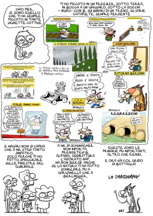 Per chi disegna questa roba che chiamano ‘satira politica’ le persone fisiche e reali che si muovono nel Palazzo diventano personaggi, figurine alle quali ci si affeziona. A chi più, a chi meno. Bersani è sempre stato il mio preferito. Oggi Pier Luigi Bersani, quello vero, è stato colto da un malore e la mia ‘figurina disegnata’ incrocia le dita per lui.