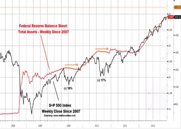 E così di bolla in bolla nei secoli dei secoli. Per i lettori che nei commenti invocano cifre ecco scodellato un grafico: in rosso le immissioni settimanali di liquidità, in nero l’indice S&P500 alla Borsa di New York.