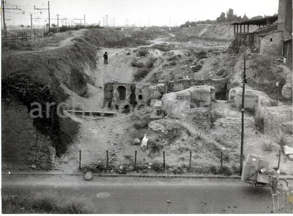 Una fotografia dell’area, scattata da Cederna alla metà degli anni Cinquanta, restituisce una situazione completamente diversa da quella attuale. Non c’è ovviamente traccia di cancellate. Non esistono le opere infrastrutturali che hanno “chiuso” la vista verso la Colombo. Né ci sono ancora le urbanizzazioni che di lì a poco invaderanno tanto spazio. La modernizzazione era ancora lontana. Lo sviluppo della città appena iniziato.
