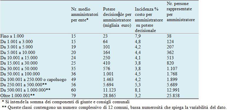 Tabella 3 – Costo, potere decisionale e ampiezza della rappresentanza per amministratore locale*