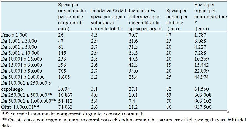 Nella tabella 1 sono riportati i valori medi per classe demografica degli enti.