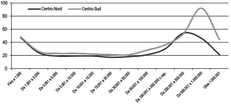 I dati evidenziano, dunque, la presenza di costi da eccesso di frammentazione nei comuni fino a 15mila abitanti e di costi da maggiore complessità per quelli superiori ai 30mila abitanti. Emerge poi un divario tra i comuni del Centro-Nord e quelli del Centro-Sud (Lazio e Regioni meridionali), dove i secondi tendono ad avere una spesa per abitante più elevata, specialmente in corrispondenza delle maggiori città, da cui si ricava che le città del Sud gestiscono in modo meno efficiente la funzione di rappresentanza democratica (grafico 2).