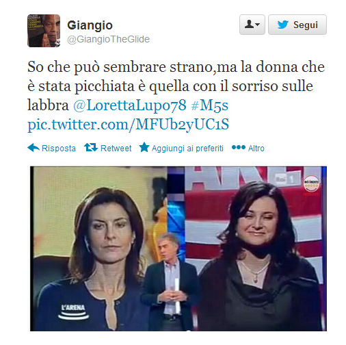 Qualcuno si accorge che a ‘L’Arena‘ viene scelto come titolo “Onorevoli insultate”, mentre una deputata M5S (evidentemente di serie B per Giletti) è stata schiaffeggiata e mentre il popolo italiano è stato preso a sberle due volte: la prima quando la Boldrini ha negato la possibilità all’opposizione di svolgere il suo ruolo (e quindi si zittiscono anche i milioni di italiani che non hanno votato i partiti della maggioranza), la seconda regalando miliardi di soldi pubblici alle banche private.