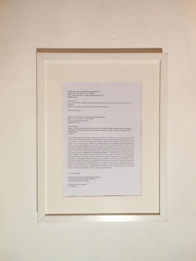 Una galleria d’arte contemporanea di Bologna – la Spazio Testoni – ha appena inaugurato una mostra di interpretazioni contemporanee della Ragazza con l’orecchino di Perla, il capolavoro di Vermeer trionfalmente esibito poco lontano, a Palazzo Fava. Uno degli artisti invitati a partecipare, Giovanni de Gara, mi ha chiesto di spiegargli perché fossi contrario a questa clamorosa operazione di marketing: e ha deciso di incorniciare ed esporre in quella mostra proprio la mail con la quale gli ho risposto (vedi foto).