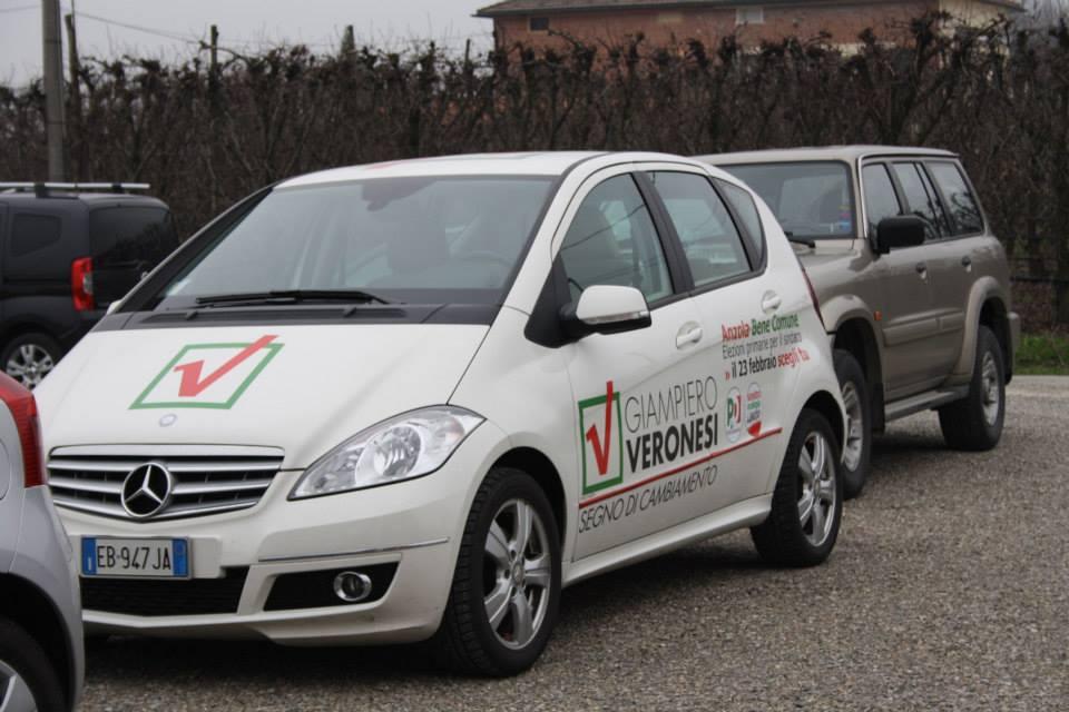 Veronesi usa tutte le armi per vincere, quelle tradizionali degli incontri, delle assemblee nei centri sociali e nei circoli ma non disdegna d’impiegare anche le armi nuove del marketing politico-pubblicitario ed ecco che ha tappezzato l’auto con il logo del suo nome (una V allungata che somiglia molto alla R stilizzata di Matteo!) e tra le altre trovate ha perfino scelto di distribuire caramelle con lo stesso simbolo.
