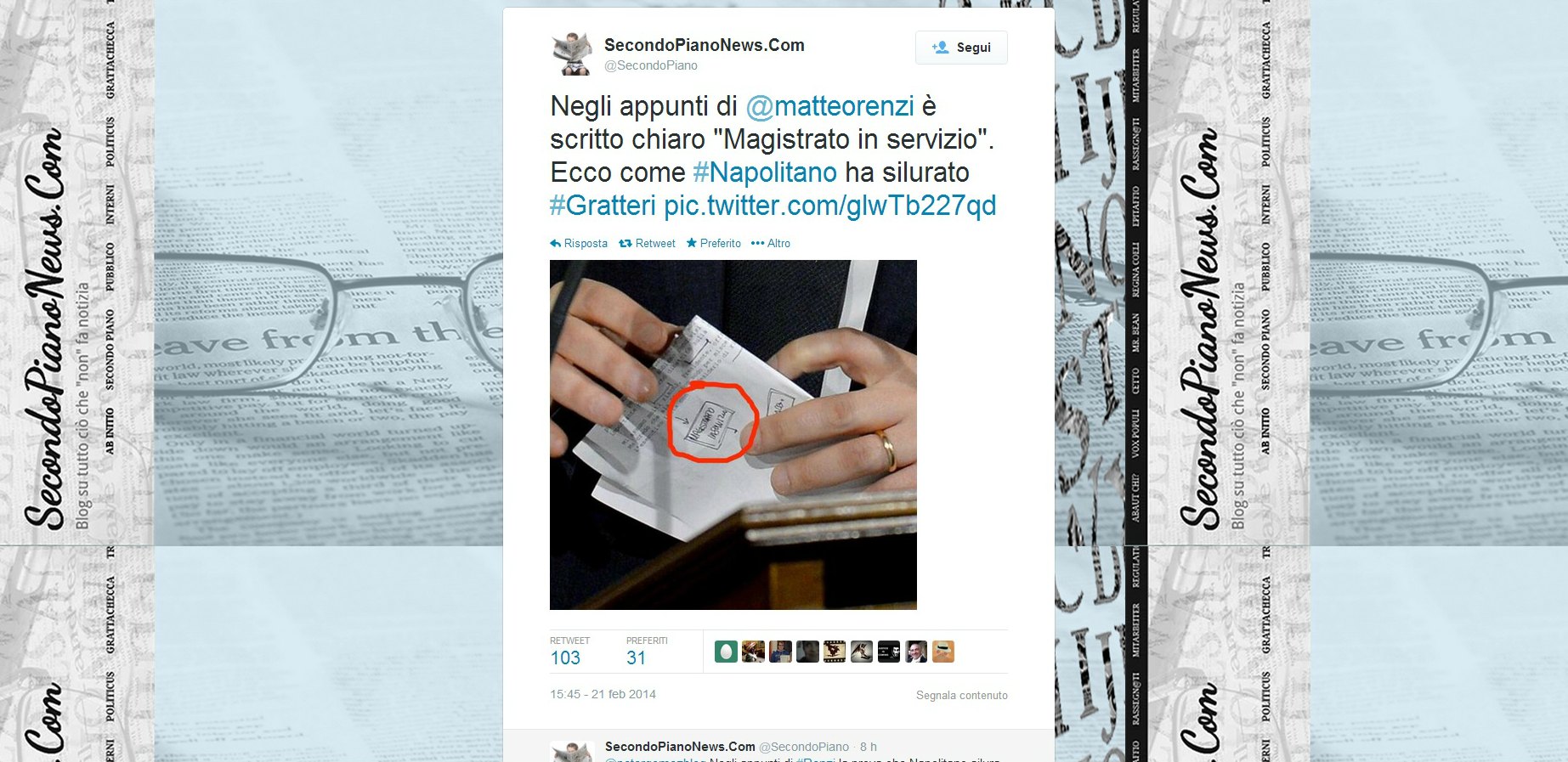 Sul profilo Twitter di “Secondo piano news” compare la foto del biglietto scritto a mano con cui Renzi si è presentato al Quirinale per presentare la lista dei ministri. Ingrandendo i caratteri si legge distintamente “magistrato in servizio”, frase che si riferisce a Nicola Gratteri, chiamato a occupare la casella della Giustizia e poi bloccato da Napolitano che ha preferito il “politico” Andrea Orlando