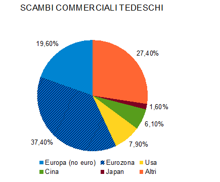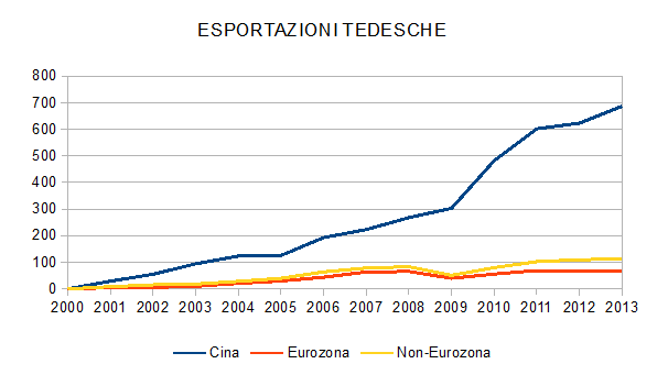 L’Eurozona rappresenta da sola più di un terzo di tutti l’export tedesco. Dal grafico si può notare come le esportazioni verso questi paesi sia in diminuzione rispetto al 2011, e ancora sotto i livelli pre-crisi del 2008. Al contrario, l’export verso i paesi fuori dall’euro è in costante crescita, uno più di tutti: la Cina.