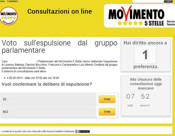 Le elezioni Europee – Nello stesso post in cui viene lanciata la consultazione sulle espulsioni, Grillo affronta anche un altro tema: le elezioni Europee. “Abbiamo una battaglia – dice – dobbiamo vincere le europee e le vinceremo. Daremo il sangue per le europee. Daremo il sangue sulle strade: molti di voi andranno sui palchi di tutti i comuni. 4 mila comuni e due regioni vanno alle elezioni, abbiamo le europee. Non ci possiamo permettere ancora di parlare di gente che bisbiglia ai giornali, dopo 5 minuti che hai parlato sei sul giornale con il titolone. Basta queste cose qui, se vogliono fare un partito con il Corriere, la Repubblica, Libero e l’Unità se lo facciano… e i talk show… che vadano pure ai talk show! Avranno adesso una grande trasparenza sui media, benissimo! E attraverso loro i media arriveranno forse a scalare ancora qualche posizione sulla libertà di stampa, siamo al settantesimo e magari con loro andremo al settantunesimo. Noi andiamo avanti, con cuore. Coraggio e vinceremo!”.
