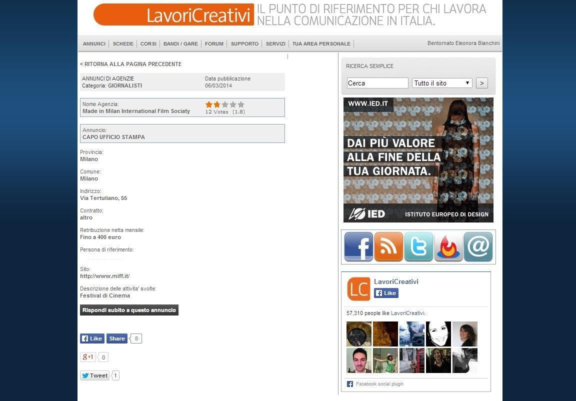 Se lavori in nero sono 500 euro, altrimenti se si vuole un contratto sono 400. Ma “a progetto”, non mensili. Quindi in tutto, per due mesi e mezzo. Parlano così dall’agenzia Made in Milan International Film Society, per spiegare quanto ammonta lo stipendio di capo ufficio stampa del Milano International Film Festival (Miff). La kermesse quest’anno arriva alla 14esima edizione e si svolgerà a maggio nel capoluogo lombardo. Sul suo profilo LinkedIn dice di essere “soprannominata dalla stampa il ‘Sundance milanese'” nonché “mostra di cinema indipendente a Milano“. Una manifestazione che pure quest’anno, dice l’agenzia a ilfattoquotidiano.it, è patrocinata anche dal Comune. E chissà se, oltre all’amministrazione Pisapia, anche nel 2014 ci saranno pure gli enti pubblici dell’anno scorso: Regione Lombardia, Provincia di Milano, Expo 2015, Lombardia Film Commission e Istituto italiano di Cultura.