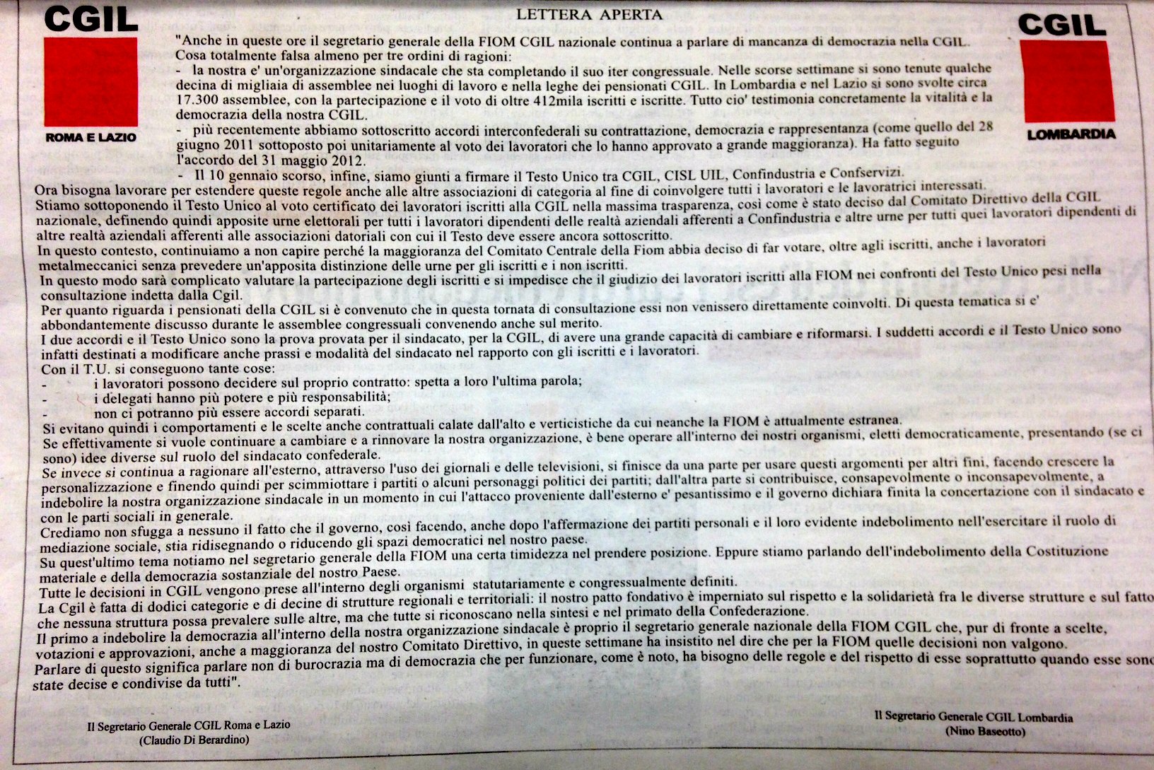 La lettera è solo l’ultimo capitolo della guerra in atto fra i due sindacati, con Susanna Camusso che di recente è arrivata addirittura a “scomunicare” Maurizio Landini. La novità sta appunto nelle munizioni scelte dai due segretari di Lazio e Lombardia: per screditare Landini, la Cgil è disposta anche a pagare spazi pubblicitari su “L’Unità”. La rottura è sempre più profonda.