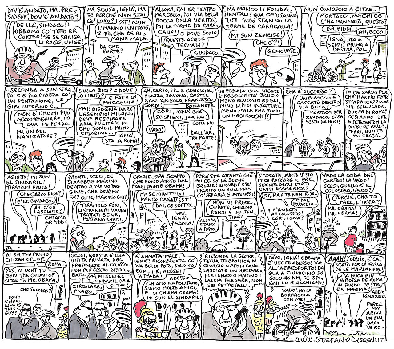 Chi ha detto che Roma non ha un sindaco? . Certo, è particolare con quella bici. E poi nessuno lo aiuta, nessuno gli dà credito. Nemmeno Obama lo vuole incontrare…