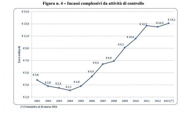 Nel 2013 l’Agenzia delle Entrate ha riscosso 13,1 miliardi di euro grazie alle proprie attività di controllo. Ma  90 miliardi restano da raccogliere: è questa, infatti, la differenza tra ciò che i contribuenti dovrebbero versare spontaneamente e ciò che viene realmente pagato all’Erario. Lo ha detto il direttore dell’Agenzia, Attilio Befera, in audizione nella commissione Finanze del Senato. Non solo: le Entrate hanno dovuto rimborsare ben 13,5 miliardi a 1,5 milioni di famiglie e imprese che avevano pagato più del dovuto e vantavano quindi crediti di imposta. In particolare, ad aziende, artigiani e professionisti sono stati versati 11,5 miliardi di rimborsi Iva, mentre a privati cittadini e imprese sono stati restituiti altri 1,8 miliardi per Irpef e Ires versate in eccesso. A quasi 31mila ultra 75enni che, avendo redditi bassi, hanno diritto all’esenzione, è poi stato rimborsato il canone Rai. Befera, parlando in Senato, si è concentrato sull’aumento delle somme recuperate in seguito alle verifiche delle Entrate: 13,1 miliardi, appunto, contro i 12,5 del 2012. Risalendo ancora più indietro, a dieci anni fa, gli incassi da attività di controllo (vedi grafico) si fermavano a 2,5 miliardi.  “L’efficacia dei controlli”, ha sottolineato Befera, “ha consentito di raddoppiare il rendimento in termini di riscosso rispetto alla pretesa” e “di rafforzarne la sostenibilità in giudizio”: l’Agenzia vince il 64% delle cause, pari al 75% dei valori in contestazione.