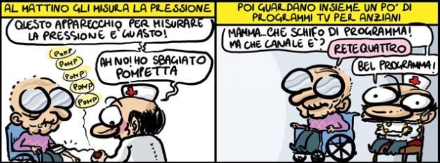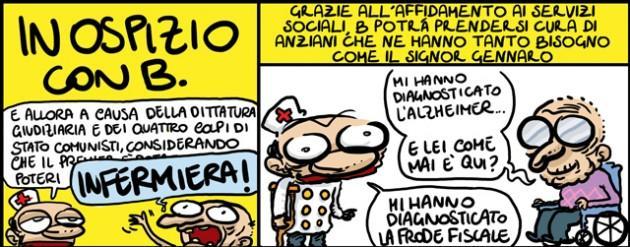 A quanto pare il destino giudiziario e politico di Silvio Berlusconi si avvia a una definizione: assistenza agli anziani, forse in una clinica nell’hinterland milanese. Personalmente, credo sia una soluzione interessante per B, che potrà così conoscere tanti anziani come lui e come il Signor Gennaro che vedrete in questa striscia.