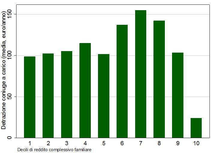 Oggi il fisco italiano prevede la detrazione per il coniuge a carico. Il costo totale per l’erario è di oltre 3,5 miliardi di euro, ma l’impatto sui redditi delle famiglie italiane rimane limitato dal momento che il beneficio medio a famiglia è di poco più di 100 euro l’anno, con un numero rilevante di famiglie che ne usufruiscono pur avendo livelli di reddito significativamente maggiori della media (si veda figura 1 e la tabella 1 in cui mettiamo i valori medi in euro del reddito complessivo e disponibile medio per decile).