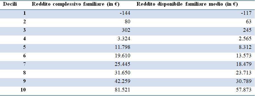 Tabella 1 – Redditi complessivi e disponibili per decili di reddito