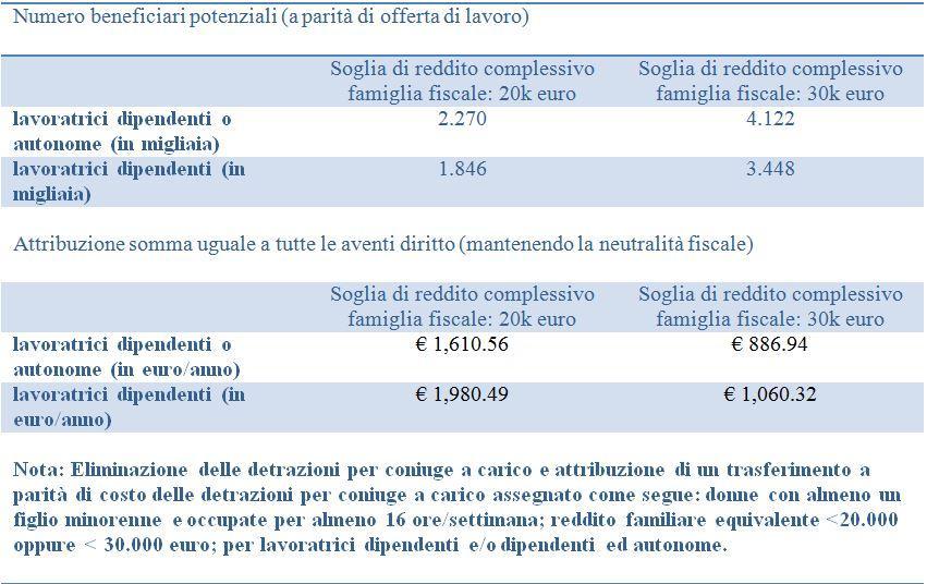 Non abbiamo qui considerato possibili effetti sull’elasticità dell’offerta di lavoro. È assai probabile che una politica di questo tipo abbia effetti comportamentali, rendendo imprecise le nostre stime di costo.