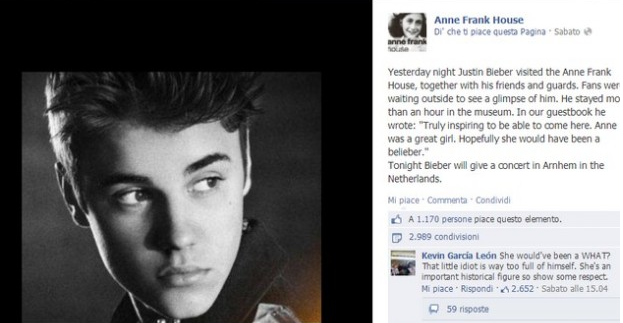 Giusto per far inquadrare meglio il personaggio, si consideri che nel giugno del 2013 Justin Bieber si è affacciato dal balcone del proprio hotel a Toronto concedendosi il lusso di sputare su una folla di fan adoranti che erano giunti sul luogo insieme ai fotoreporter per immortalare la superstar. Il tutto, tra le risate degli amici e la cieca adorazione dei destinatari della saliva. Senza contare il caso Anna Frank, tragica vittima dell’Olocausto tirata maldestramente in ballo dopo averne visitato la casa-museo ad Amsterdam, sostenendo che «è stata una grande ragazza» e che probabilmente «sarebbe stata una belieber» anche lei, se solo il tempo gliel’avesse concesso. Di questo livello di egotismo stiamo parlando.