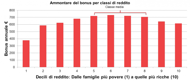 - Le famiglie di classe media saranno anche quelle a ricevere un ammontare di bonus più alto di tutti nel 2014: circa 720 € a fronte delle famiglie più povere che avranno un bonus di 380 € in media. La motivazione principale risiede nel fatto che le famiglie italiane più povere sono più spesso famiglie a mono reddito (solo un lavoratore dipendente) e con un impiego non necessariamente stabile (riducendo il bonus fiscale che si calcola sul totale dei mesi lavorati in un anno).