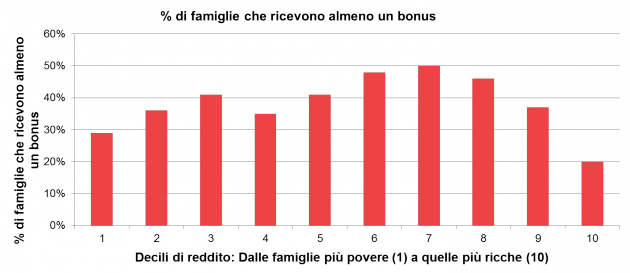 - Le famiglie più povere non sono del tutto escluse: tuttavia solo una su tre delle famiglie appartenenti al primo decile della distribuzione del reddito (il 10% delle famiglie italiane più povere) percepirà un bonus.