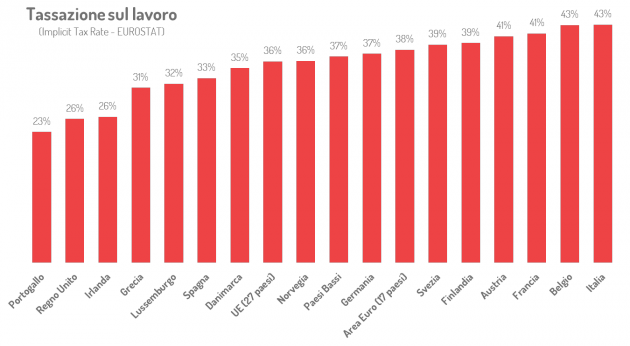 Si tratta sostanzialmente di una riduzione della tassazione sul lavoro (notoriamente molto elevata in Italia come si vede dal grafico qui sotto) o del cosiddetto cuneo fiscale: la differenza fra il costo totale del lavoro e ciò che entra nelle tasche del lavoratore. In pratica, il decreto prevede che il datore di lavoro (che agisce da “sostituto d’imposta”) riduca le trattenute fiscali per il lavoratore dipendente in modo da aumentare lo stipendio di 80 € al mese (parliamo qui sotto di chi percepirà questo “bonus”). Se le trattenute Irpef non sono sufficienti per ottenere l’ammontare di 80 € allora il datore di lavoro potrà ridurre le i trattenute contributive ai fini pensionistici (clicca qui e qui per approfondire).