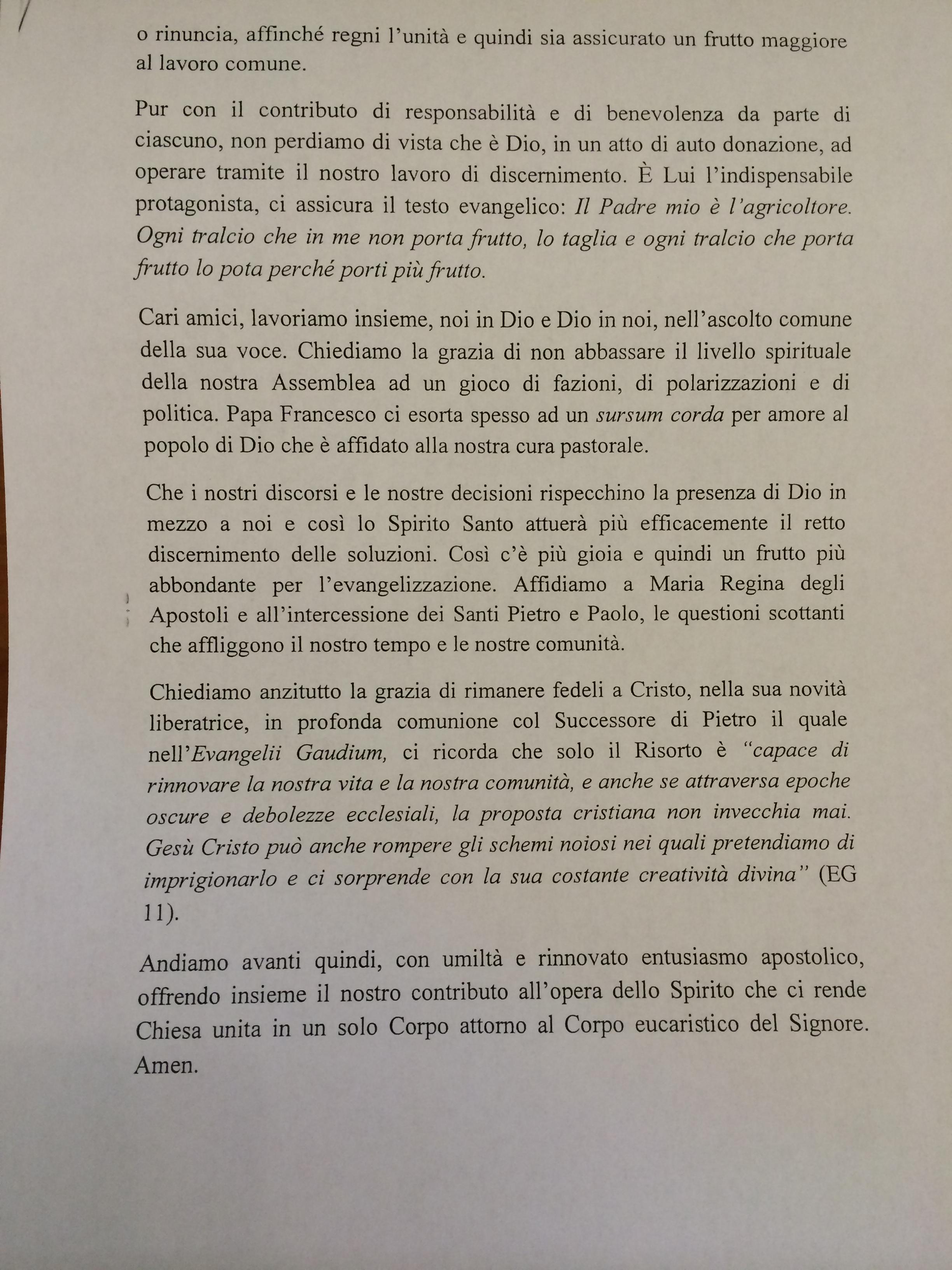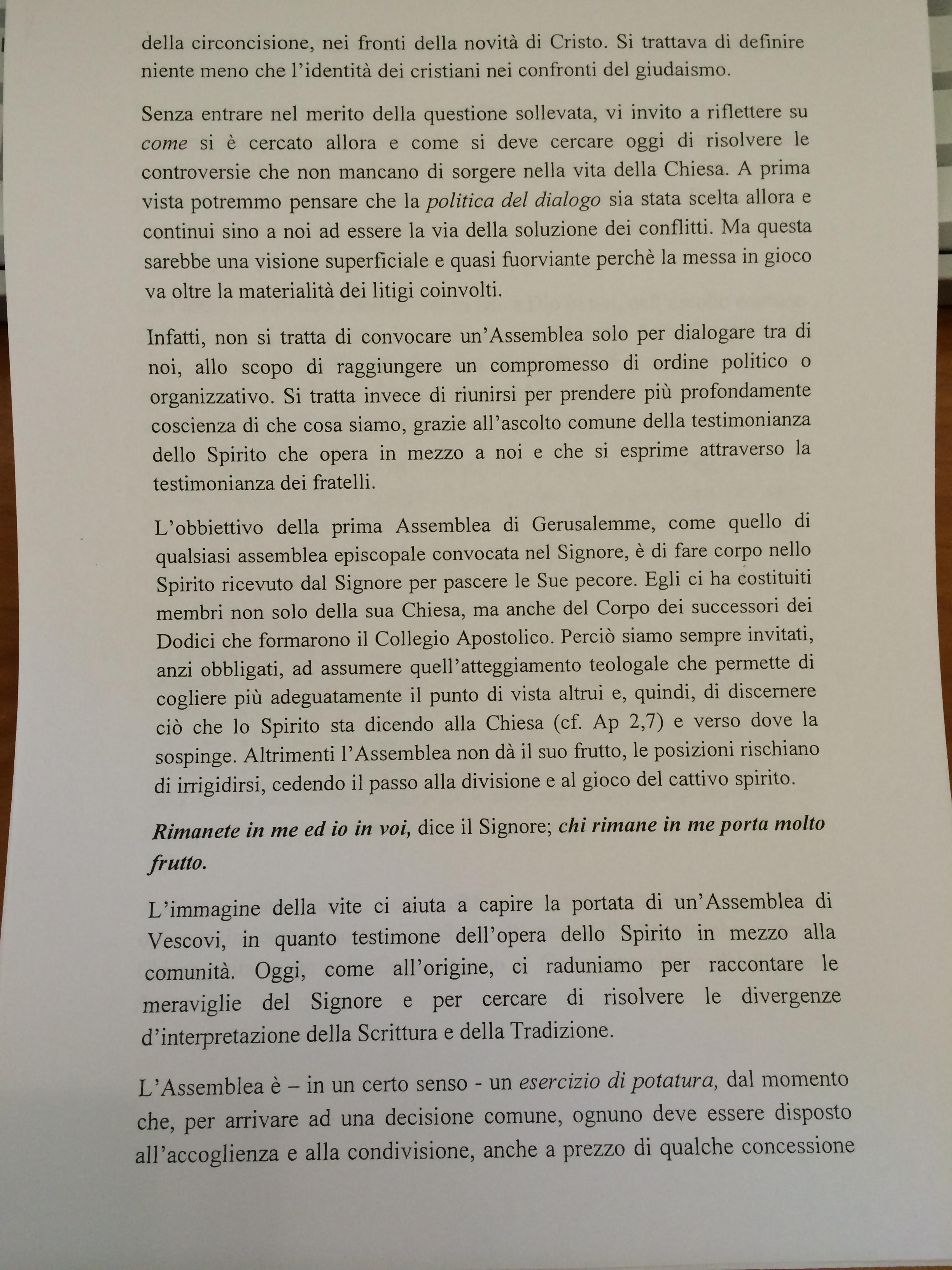 In un altro passaggio significativo, il prefetto della Congregazione per i vescovi ha invitato l’episcopato italiano a “cercare oggi di risolvere le controversie che non mancano di sorgere nella vita della Chiesa. A prima vista – ha aggiunto Oullet – potremmo pensare che la politica del dialogo continui a essere la via della soluzione dei conflitti. Ma questa sarebbe una visione superficiale e quasi fuorviante perché la messa in gioco va oltre la materialità dei litigi coinvolti. Infatti, – ha proseguito il porporato – non si tratta di convocare un’assemblea solo per dialogare tra di noi, allo scopo di raggiungere un compromesso di ordine politico od organizzativo. Si tratta invece di riunirsi per prendere coscienza di che cosa siamo”. E ancora: “Siamo sempre invitati, anzi obbligati, ad assumere quell’atteggiamento teologale che permette di cogliere più adeguatamente il punto di vista altrui e, quindi, di discernere ciò che lo Spirito sta dicendo alla Chiesa e verso dove la sospinge. Altrimenti l’assemblea non dà il suo frutto, le posizioni rischiano di irrigidirsi, cedendo il passo alla divisione e al gioco del cattivo spirito”.