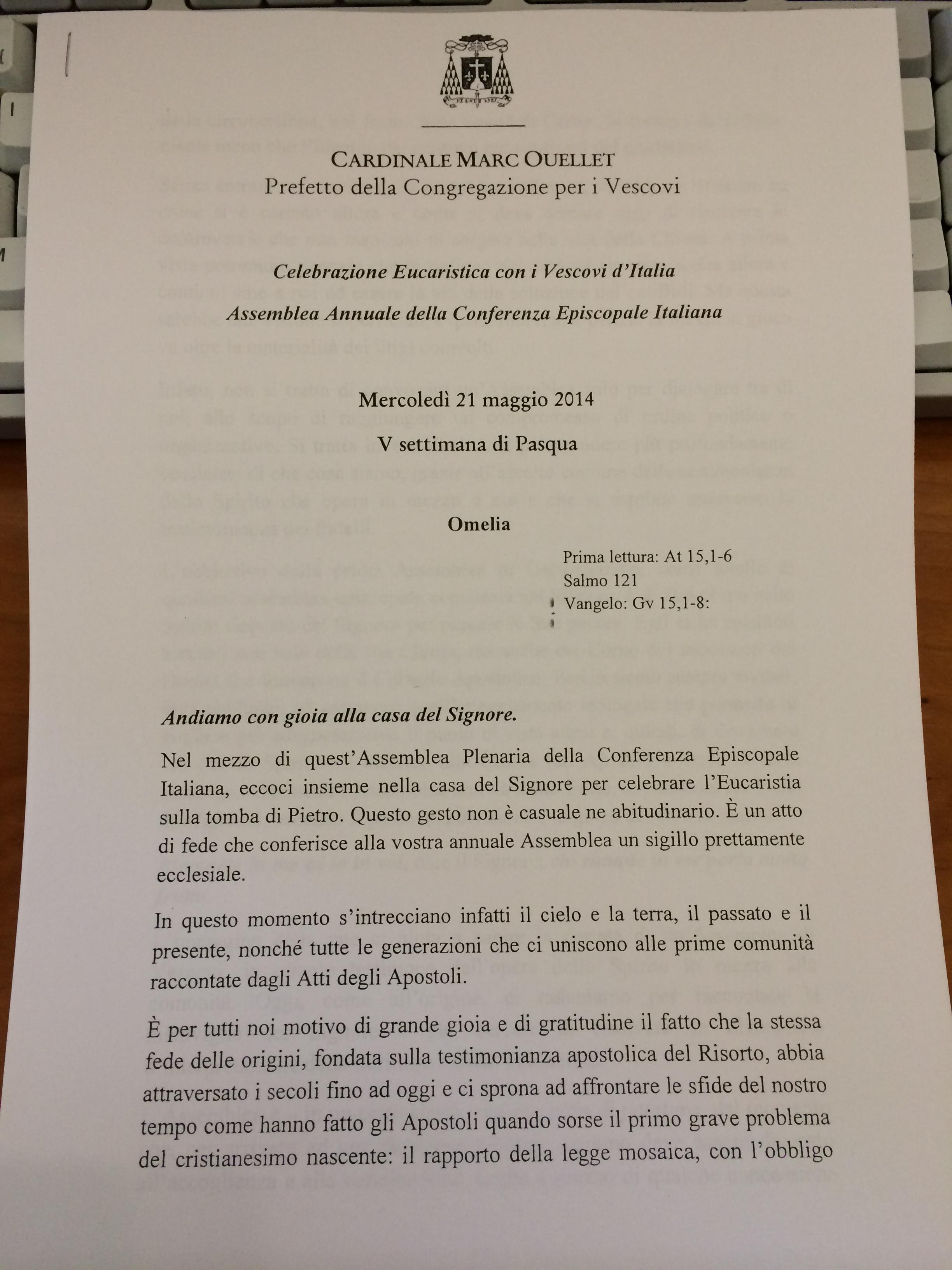 Non abbassiamo il livello spirituale della nostra assemblea a un gioco di fazioni, di polarizzazioni e di politica”. Dopo quella di Papa Francesco, la nuova sferzata alla Cei di Angelo Bagnasco è arrivata inaspettata dal prefetto della Congregazione per i vescovi, il cardinale Marc Ouellet, nell’omelia che il porporato ha tenuto stamani all’episcopato italiano nella Basilica Vaticana e che ilfattoquotidiano.it pubblica integralmente. “L’assemblea è, in un certo senso, – ha scandito Ouellet – un esercizio di potatura, dal momento che, per arrivare a una decisione comune, ognuno deve essere disposto all’accoglienza e alla condivisione, anche a prezzo di qualche concessione o rinuncia, affinché regni l’unità e quindi sia assicurato un frutto maggiore al lavoro comune”.