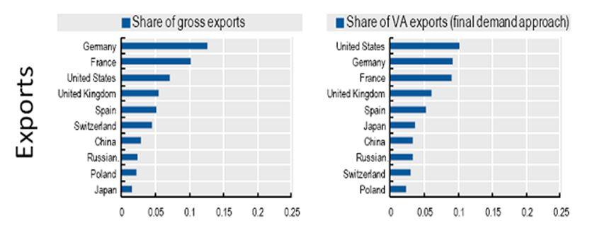 Ma come si posiziona l’Italia rispetto a queste dinamiche? Per rispondere, possiamo guardare ai dati recentemente pubblicati dall’Oecd che fanno vedere come l’importanza dei diversi mercati di esportazione del nostro paese cambia se distinguiamo tra esportazioni lorde (ossia dove vanno fisicamente i nostri beni quando escono dai confini nazionali) ed esportazioni in valore aggiunto (ossia quale domanda viene servita dai nostri beni quando escono dai confini nazionali, ma entrano nella produzione di beni di altri paesi prima di essere consumati). Come si può vedere dai grafici sottostanti, quello che emerge è che la Germania è di gran lunga al primo posto come mercato di sbocco delle nostre esportazioni (lorde). Ma se guardiamo al principale mercato dalla cui domanda dipendono le nostre esportazioni, scopriamo che è quello degli Stati Uniti. (4)