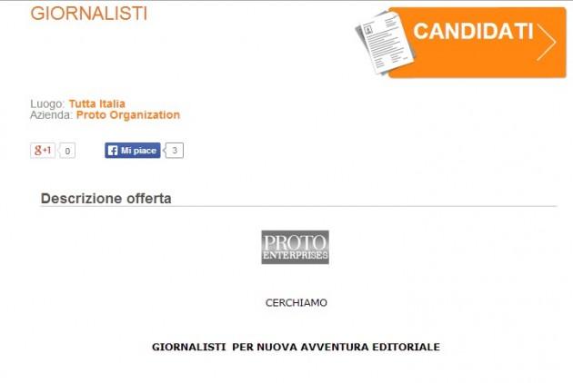 E pensare che voleva comprarsi, nell’ordine, Corriere della Sera, Sole 24 Ore, un pezzo del gruppo Espresso, Il Fatto Quotidiano, il defunto Pubblico e – già che c’era – anche una fettina di Mediaset e Telecom Italia Media. Ora, invece, il giornale ha deciso di farselo in casa. La Proto Organization, creatura dell’ex sedicente finanziere e agente immobiliare dei vip Alessandro Proto, “cerca giornalisti per nuova avventura editoriale”. E, ironia della sorte, lo fa attraverso il canale TrovoLavoro del Corriere, di cui nell’ottobre 2012 sosteneva di aver acquisito il 2,7% – salvo, quattro mesi dopo, essere finito in manette per aver “divulgato false informazioni idonee ad alterare in maniera sensibile il prezzo delle azioni Rcs e Tod’s”, altra vittima (come Mediobanca, Unicredit, Generali, FonSai, Mps e chi più ne ha più ne metta) dei suoi presunti raid per conto di “investitori italiani e stranieri”.