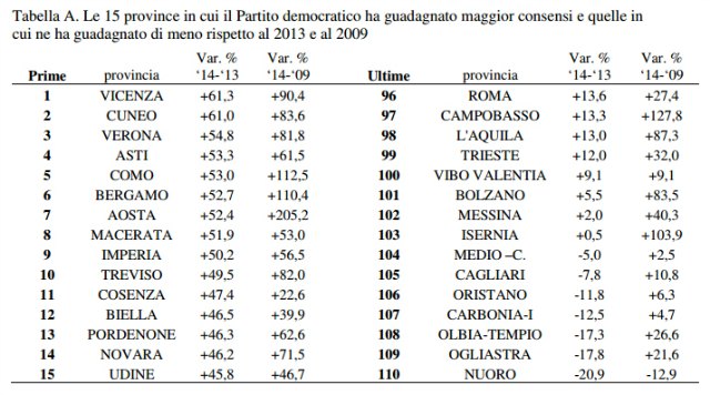 Il Pd, notano i ricercatori, è avanzato rispetto al 2014, “in tutte le regioni (tranne in Sardegna -6,1%) ed è primo partito in tutte le regioni nonché in testa in tutte le province italiane , tranne tre (Bolzano, Isernia e Sondrio)”. Da notare gli exploit in molte province del profondo Nord, con percentuali più che raddoppiate rispetto al 2009 a Como e a Bergamo e con una crescita di oltre il 50% rispetto al 2013 a Verona e a Vicenza. In media, gli incrementi sono più contenuti al centrosud, e in netto declino in tutte le province sarde (vedi tabella A).