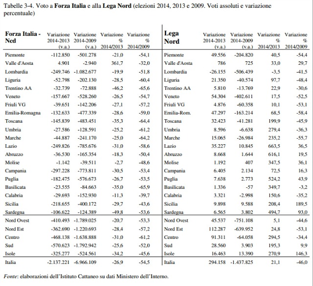 La sconfitta del centrodestra è spalmata tra tutte le regioni italiane. Forza Italia e Ncd, che insieme componevano fino alle scorse politiche la corazzata del Pdl, rispetto alle politiche perdono la metà tonda dei voti in Sardegna e oltre il 46 in Trentino-Alto Adige, mentre il calo rispetto alle europee del 2009 supera il 60% in ben sei regioni, tra le quali la Liguria e diverse centrali, a partire dalla Toscana (vedi tabelle 3-4).