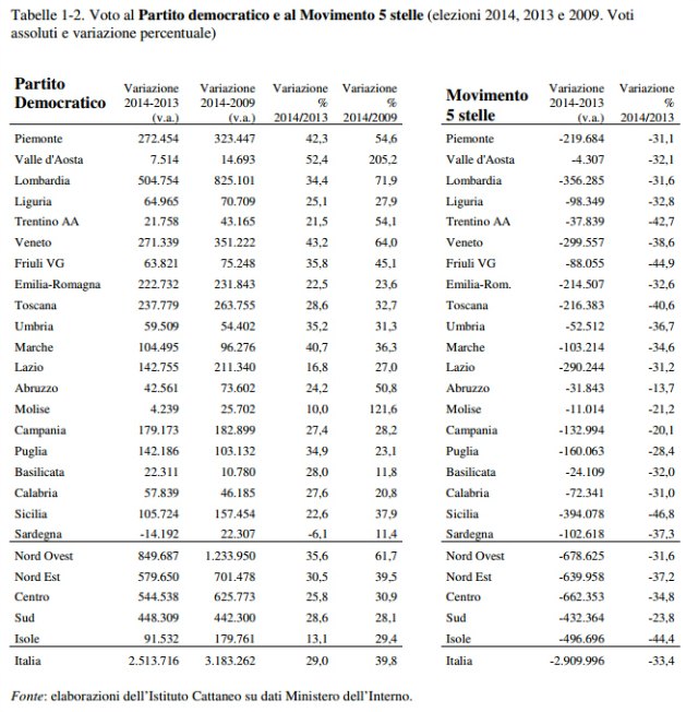 Il vincitore incontrastato della competizione, il Partito democratico, ha guadagnato 3.183.262 voti rispetto alle europee del 2009, “tuttavia ha significativamente incrementato anche i voti del 2013”, aumentati di 2.513.716 unità. In termini percentuali la crescita è del 29% rispetto alle scorse politiche e del 40% rispetto alle europee di cinque anni fa.
