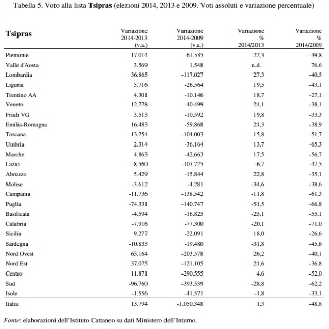 E la lista Tsipras? I ricercatori registrano il paradosso per il quale c’è voluto un leader greco, Alexis Tsipras, per “superare la sindrome del cartello elettorale che dal 2008 affligge la sinistra”. Perché “grazie alla principale compente della lista che prende il nome dall’esponente politico ellenico a capo si Syriza, ossia a Sel, è stato, per il momento, arrestato il declino elettorale dell’area politica a sinistra del Partito democratico”. Anche la lista Tsipras, secondo i ricercatori del Cattaneo, ha recuperato parte dei consensi finiti a Beppe Grillo: “La mobilitazione delle ultime settimane ha plausibilmente ri-motivato parte dell’elettorato astenuto alle scorse politiche o che aveva optato per il Movimento 5 stelle”. Dal punto di vista della distribuzione gografica, la Lista Tsipras registra il miglior incremento in Lombardia (+27,3%) e in generale nel Nord, mentre perde al sud e soprattutto in Puglia. Nella regione retta dal leader di Sel Nichi Vendola, l’isttuto Cattaneo valuta un calo del 51,5% rispetto alle politiche del 2013 (vedi tabella 5).