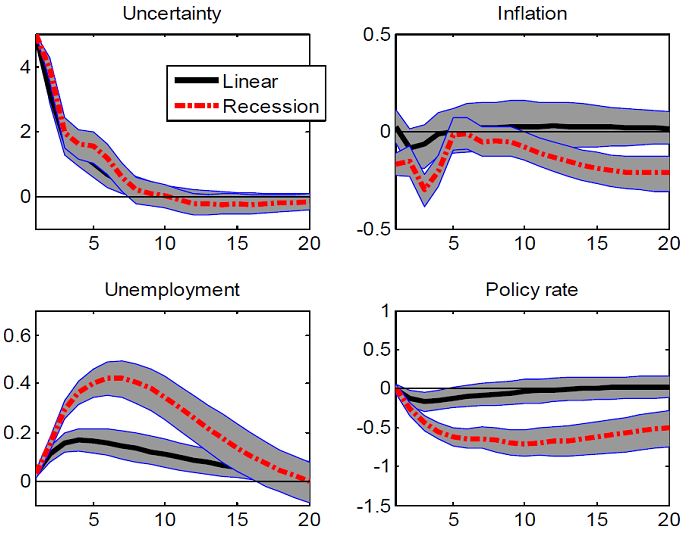 In linea con quanto sostenuto dalla teoria economica, inoltre, il nostro esercizio suggerisce che l’effetto temporaneamente deflattivo di uno shock di incertezza è maggiore quando l’incertezza aumenta in recessione, costringendo quindi le autorità di politica monetaria a rispondere in maniera più forte, abbassando in misura maggiore il tasso di interesse.