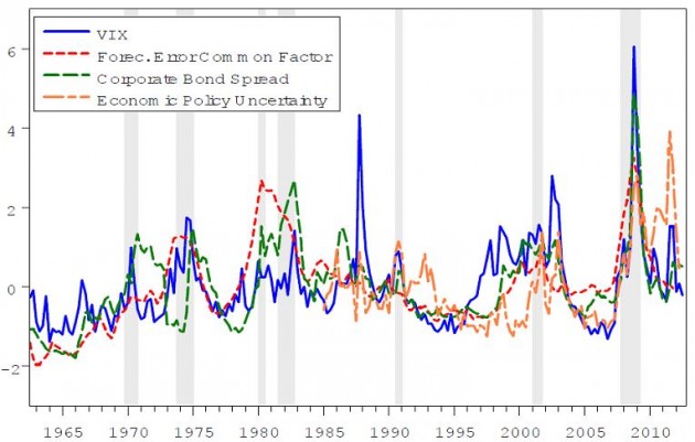 Indicatori di incertezza economica. Dati statunitensi, campione: 1962Q3-2012QQ3. Barre verticali grigie: Recessioni così come datate dal National Bureau of Economic Research.