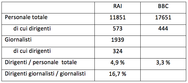 (4) Nella sua audizione del dicembre 2013, il direttore generale Gubitosi ha fornito dati su 622 dirigenti. Il bilancio del 2012, ultimo disponibile, utilizzato nella Tabella 3 riporta un numero di dirigenti pari a 573.
