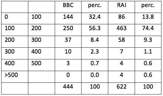 La BBC non ha stipendi sopra i 500.000 euro e solo tre stipendi tra 400.000 e 500.000 euro. La RAI ne ha quattro e quattro, rispettivamente (in realtà almeno due sono sopra i 600.000 euro). Inoltre la BBC ha una percentuale di stipendi inferiore a 100.000 euro molto maggiore, e una percentuale di stipendi tra i 100.000 e 200.000 euro molto minore. (5)