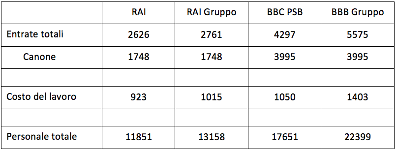 Dalla tabella risalta subito una una differenza sostanziale tra le due aziende. Il gruppo BBC è esattamente il doppio del gruppo RAI in termini di entrate totali, ma ha un costo del lavoro e un numero di dipendenti che sono superiori solo del 40 e 70 percento,rispettivamente. Percentuali simili valgono per le capigruppo.