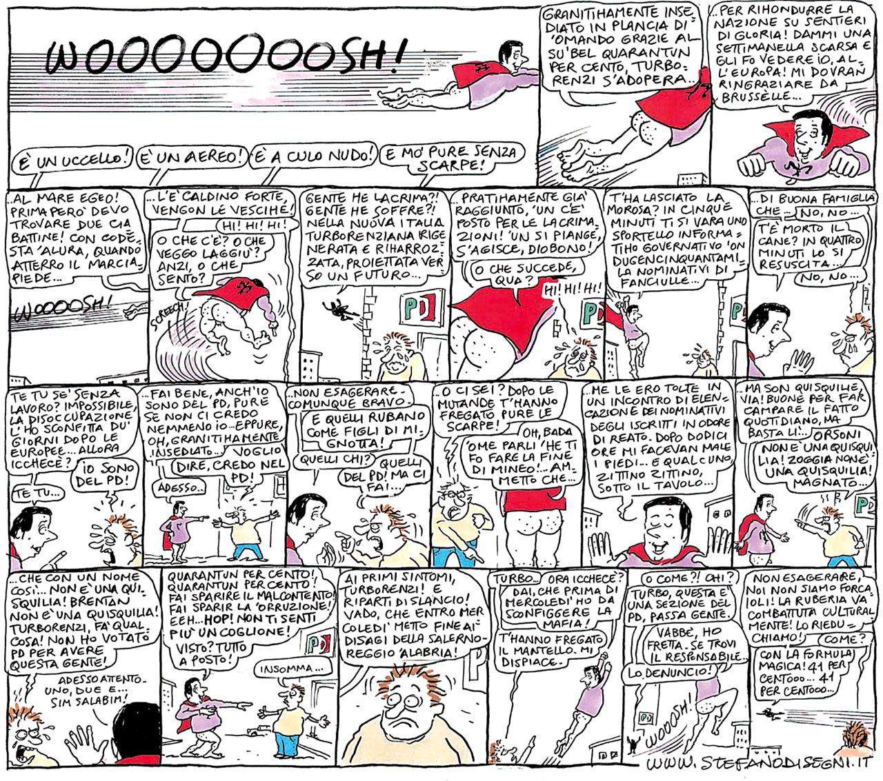 Senza pantaloni, senza mutande, senza scarpe e pure senza mantello, TurboRenzi prosegue la sua inossidabile opera. A proteggerlo c’è il voto dei cittadini…