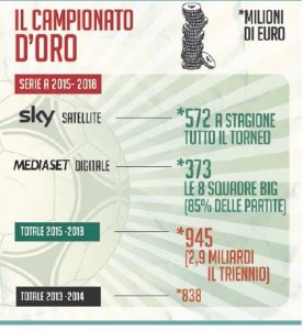 Inciucio, prodotto di fabbrica italiano: fatto a tavolino, nottetempo, non a mano. L’inciucio fra il gruppo Sky e Mediaset per i diritti televisivi, invocato e allevato dai presidenti di Serie A e da un mediatore invadente (Infront), è un inciucio epocale, perfetto nel suo essere sfacciato. Il triennio di Campionato (2015-2018) viene distribuito senza infastidire i monopolisti che fingono di indossare elmetti e poi stringono accordi. Officiano le società di A e l’ineffabile Infront: a Sky va l’intero blocco di partite per il satellite, 572 milioni di euro a stagione; salvata da Infront e da un non inedito asse Milan-Lazio, a Mediaset va l’85% di un torneo brutto e noioso inclusa la Roma, 373 milioni (un rincaro di 105 rispetto al 2013/2014).