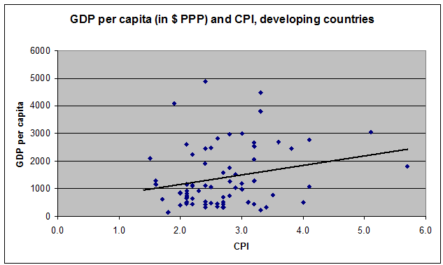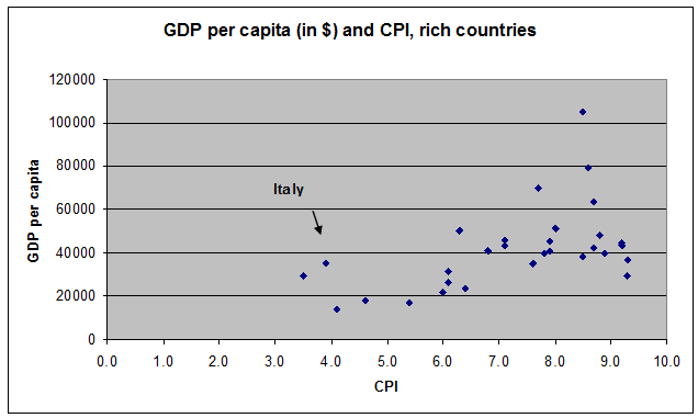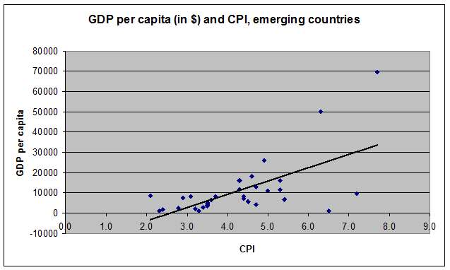 La relazione tra Pil pro-capite e Cpi è particolarmente forte per i paesi più ricchi: alti livelli di Pil sono associati a bassi livelli di corruzione. Risultati simili caratterizzano le economie emergenti.