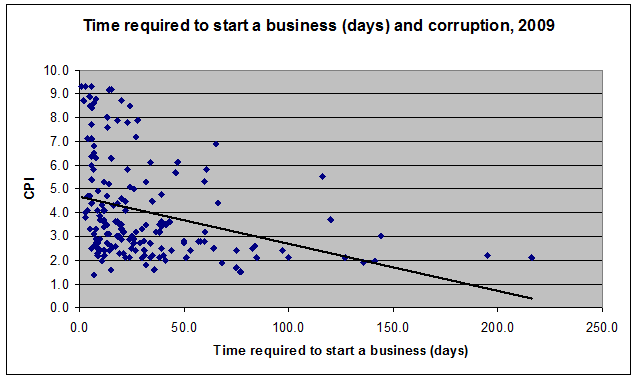 Vediamo, ad esempio, se alti livelli di corruzione sono effettivamente associati a tempi più celeri per iniziare nuove attività imprenditoriali. (13)