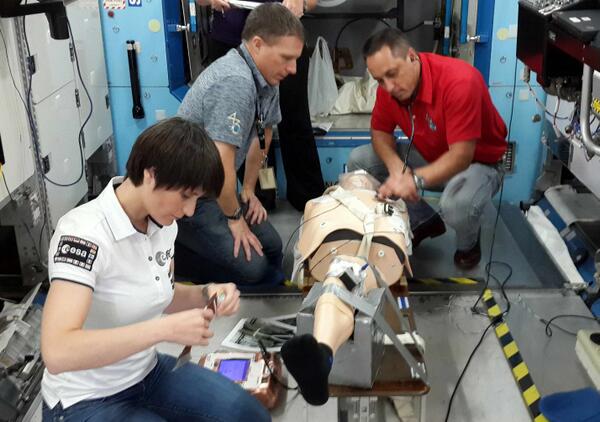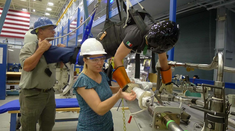 Lo stato di sospensione: “Johnson Space center (Houston, USA), 25 giugno 2014. —Lezione di robotica, addestramento con il simulatore di gravità parziale POGO per le passeggiate spaziali, e pratica con le ecografie. Oggi è stata una di quelle giornate di addestramento in cui saltate rapidamente da un argomento all’altro, mentre correte da una lezione all’altra e da un edificio a un altro al Johnson Space Center. Ho iniziato la giornata in palestra e poi sono passata a una lezione di robotica con il compagno di equipaggio Scott Kelly, che si unirà a noi sulla ISS a marzo dell’anno prossimo. È stata una lezione di “track & capture” (inseguimento e cattura): è come chiamiamo la presa di un veicolo in visita in volo libero con il braccio robotico della Stazione Spaziale […] Dopo ho avuto una lezione sul POGO. È il Partial Gravity Simulator (simulatore di gravità parziale), uno degli ambienti di addestramento che abbiamo a disposizione per prepararci alle passeggiate spaziali. Siete interessati ai pro e contro del POGO rispetto all’addestramento sott’acqua? Ecco una vecchia nota del diario su questo! […]