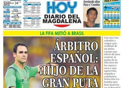 Arbitro spagnolo, figlio di quella gran p… che ti ha partorito“. E’ l’incredibile titolo scelto dal quotidiano colombiano ‘Hoy’ per commentare il ko di James Rodriguez e compagni contro il Brasile nei quarti di finale del Mondiale. Un attacco pesantissimo e senza precedenti nei confronti del direttore di gara, lo spagnolo Velasco Carballo, accusato senza mezzi termini di avere favorito i padroni di casa con una condotta di gara troppo permissiva.